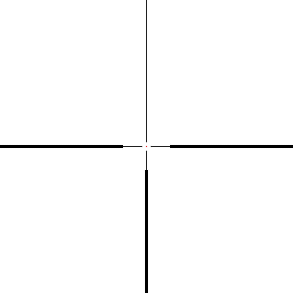 A variant of the classic L4 reticle, the L4A Dot uses a more open outer post design to keep more of the target visible while aiming. 30″ spacing from center to post at 100yds when on 4x magnification. This is equivalent to 83cm at 100m.